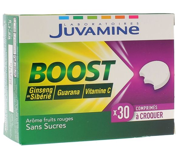 Boost Ginseng Guarana Vitamine C Juvamine se présente sous la forme d'une boîte de 30 comprimés à croquer.