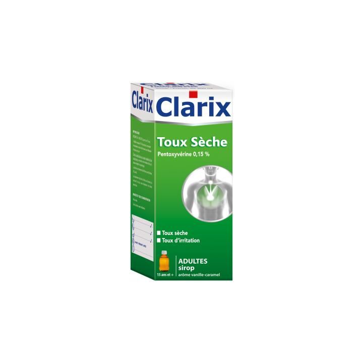 Clarix toux sèche sirop adulte est un antitussif. Il est préconisé dans le traitement de courte durée des toux sèches et des toux d’irritation chez l’adulte et l’adolescent à partir de 15 ans.