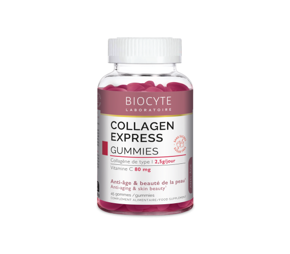 Collagen express Biocyte se présente sous la forme d'un pot de 45 gummies
