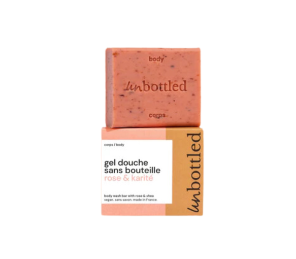 Le gel douche sans bouteille rose & karité Unbottled se présente sous la forme d'un pain de 110g.