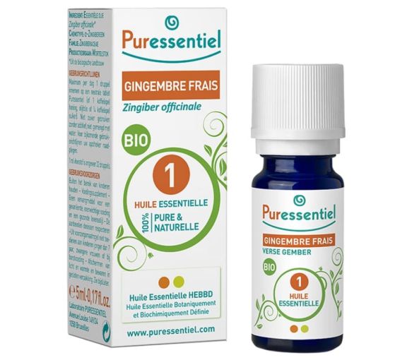 Huile essentielle bio gingembre frais Puressentiel se présente sous la forme d'un flacon de 5 ml.