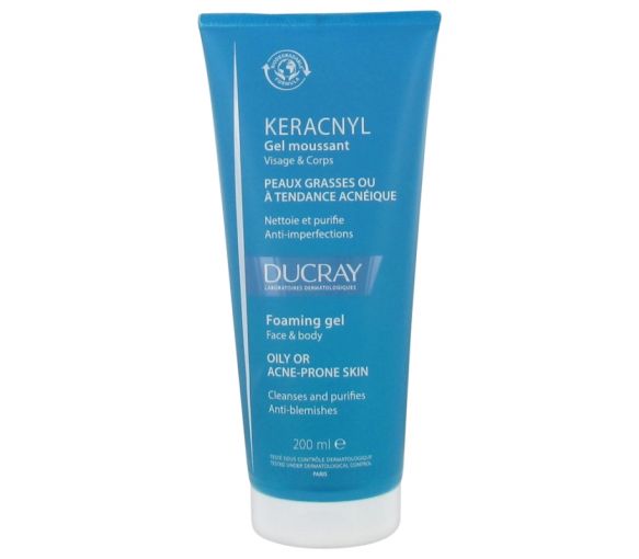 Keracnyl gel moussant visage et corps Ducray se présente sous la forme d'un tube de 200 ml