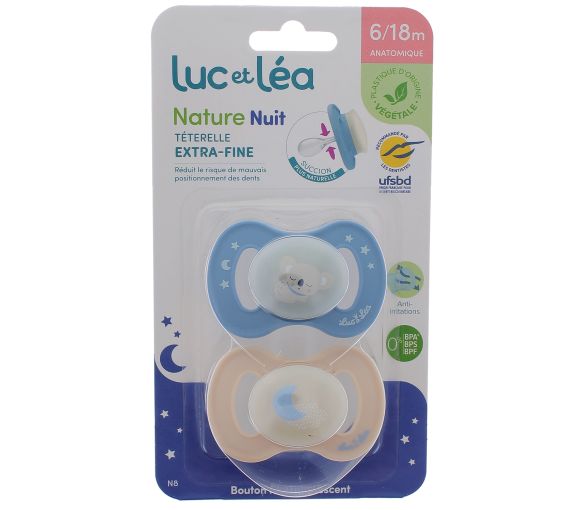 Nature Nuit sucettes anatomiques téterelle extra-fine 6-18 mois koala & lune Luc et Léa se présente sous la forme d'un lot de 2 sucettes.