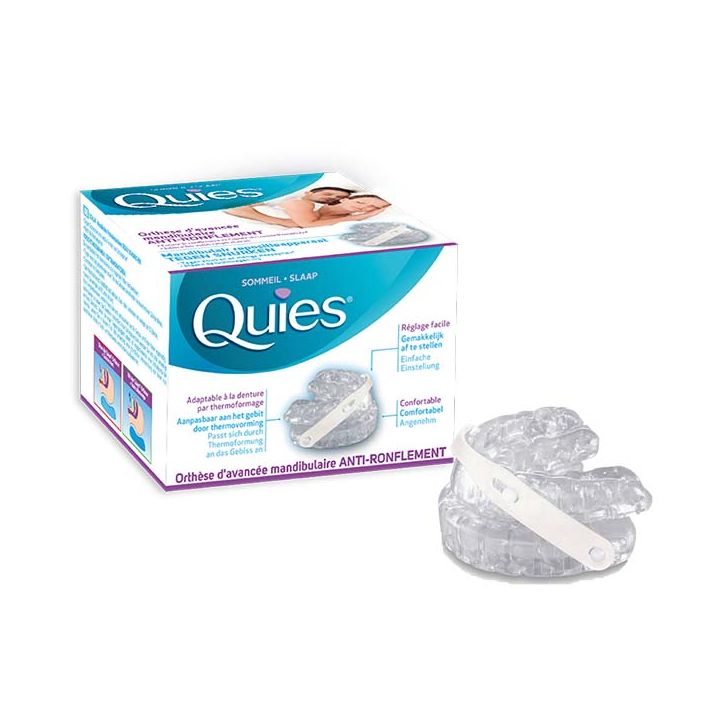 Orthèse d'avancée mandibulaire anti-ronflement Quies est un dispositif médical destiné à réduire ou supprimer le ronflement et l'apnée du sommeil modérée. En maintenant la mâchoire inférieure en position légèrement avancée (quelques millimètres), les voies respiratoires vont s'ouvrir permettant ainsi le passage de l'air.