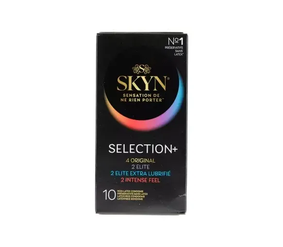 Préservatifs Skyn sélection+ Manix se présente sous la forme d'une boîte de 10 préservatifs sans latex.