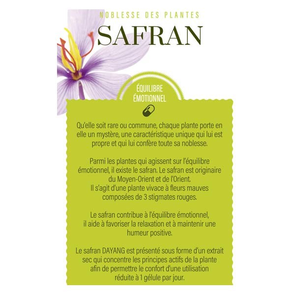 Safran équilibre émotionnel Dayang se présente sous la forme d'une boîte de 15 gélules.