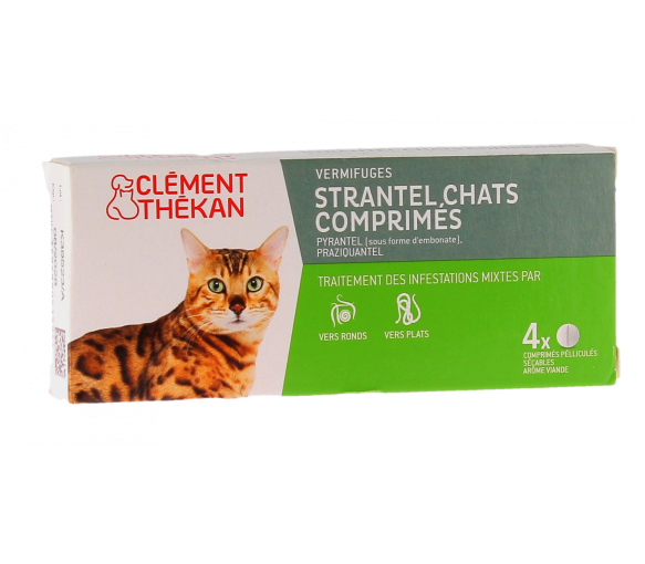 Le médicament, pour chat, Clément Thékan Strantel est un comprimé vermifuge. Il permet de traiter les animaux contre les infestations hybrides causées par les vers. Ces derniers peuvent prendre une forme plate ou ronde. Il s'agit des vers gastro-intestinaux. Les plus connus, entre eux, sont les cestodes et les nématodes. Il s'agit des vers qui dominent les intestins des chats, qui sont nuisibles, voire mortels, pour les animaux.