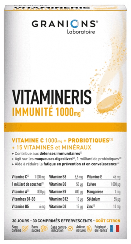 Il arrive un moment de notre vie où notre organisme s’affaiblit. En effet, les défenses de notre corps peuvent s’endormir. Granions vitamineris immunité effervescents 1000 mg a donc été conçu pour apporter tout ce dont votre corps a besoin pour booster le système immunitaire. Proposé sous forme de comprimés effervescents dans une boîte de 30 unités, ce complément alimentaire est composé de 9 vitamines et de 3 minéraux.
